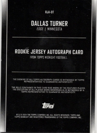 2024 Topps Midnight Dallas Turner #RJADT Rookie Jersey Autograph /50 Minnesota Vikings Rookie RC Football Card