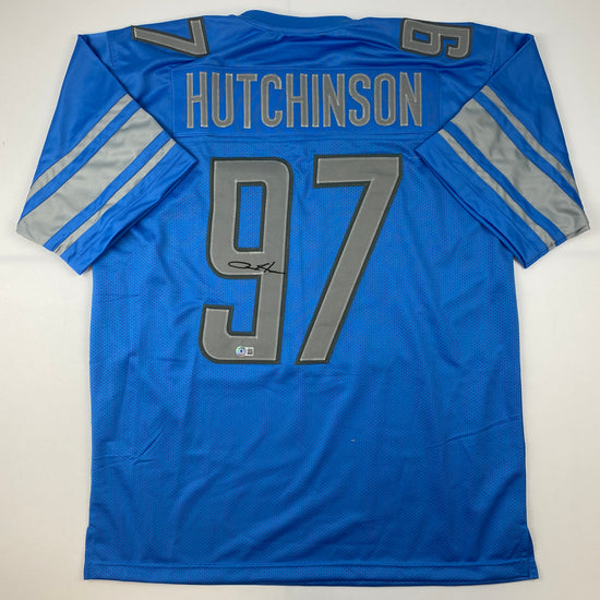 Autographed/Signed Aidan Hutchinson Detroit Blue Football Jersey Beckett BAS COA