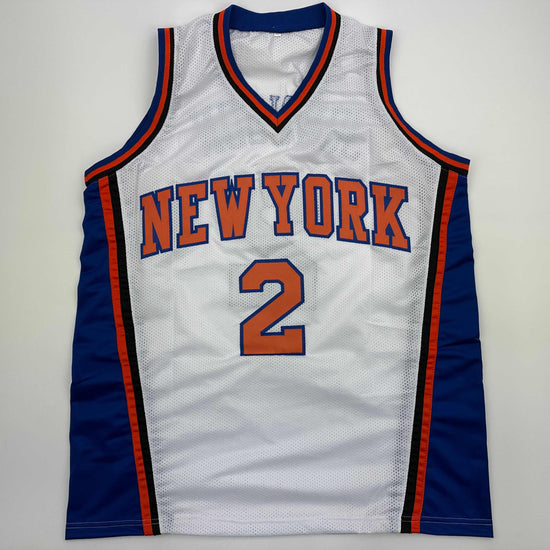Autographed/Signed Larry Johnson New York White Basketball Jersey Beckett BAS COA