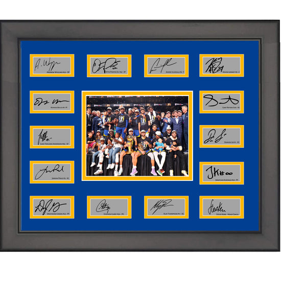Photograph itself is 8x10 and the piece includes a facsimile laser engraved signatures from 14 members of the 2021-22 Golden State Warriors (Steve Kerr, Stephen Curry, Klay Thompson, Draymond Green, Andrew Wiggins, Jordan Poole, Otto Porter Jr, Andre Iguodala, Kevon Looney, Gary Payton II, Damion Lee, Jonathan Kuminga, Juan Toscano-Anderson, Nemanja Bjelica). The total piece measures 20 inches by 25 inches. The item is professionally framed and matted and is ready to be hung in your man cave!