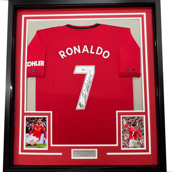 Framed Autographed/Signed Cristiano Ronaldo 35x39 Manchester United Red Soccer Futbol Jersey Beckett BAS COA