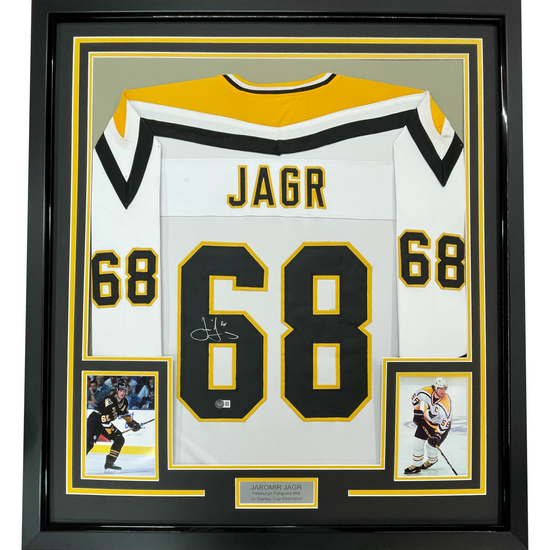 Framed Autographed/Signed Jaromir Jagr 35x39 Pittsburgh White Hockey Jersey JSA COA