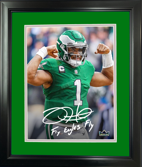 Framed Jalen Hurts Fly Eagles Fly Facsimile Laser Engraved Signature Auto Philadelphia Eagles 11"x14" Football Photo HOFSM Holo