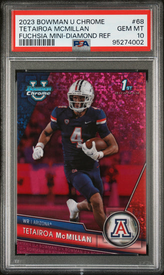 Graded 2023 Topps Bowman U Chrome Tetairoa McMillan #68 Fuchsia Mini Diamond Refractor #/150 Rookie RC Football Card PSA 10 Gem Mint