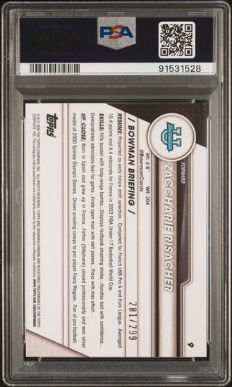 Graded 2023 Topps Bowman U Chrome Zaccharie Risacher #9 Aqua Wave #/299 Rookie RC Basketball Card PSA 10 Gem Mint