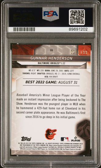 Graded 2023 Topps Bowmans Best Gunnar Henderson #26 Aqua Lava #/199 Rookie RC Baseball Card PSA 10 Gem Mint
