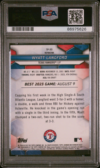 Graded 2023 Topps Bowmans Best Wyatt Langford #TP30 Top Prospects Refractor Rookie RC Baseball Card PSA 10 Gem Mint