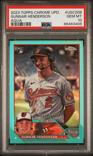 Graded 2023 Topps Chrome Update Gunnar Henderson #USC208 Aqua #/199 Rookie RC Baseball Card PSA 10 Gem Mint