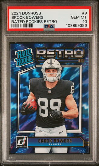 Graded 2024 Panini Donruss Brock Bowers #9 Rated Rookies Retro Rookie RC Football Card PSA 10 Gem Mint