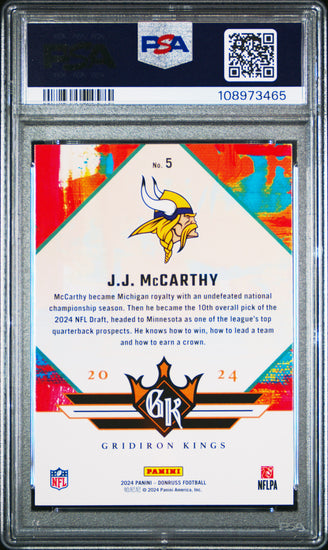 Graded 2024 Panini Donruss JJ McCarthy #5 Rookie Gridiron Kings Rookie RC Football Card PSA 9 Mint