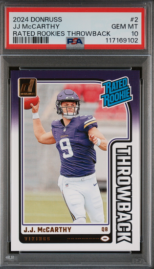 Graded 2024 Panini Donruss JJ McCarthy #2 Rated Rookies Throwback Rookie RC Football Card PSA 10 Gem Mint