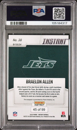 Graded 2024 Panini Instant NFL Braelon Allen #38 Autograph /99 Rookie RC Football Card PSA 9 Auto Grade Mint